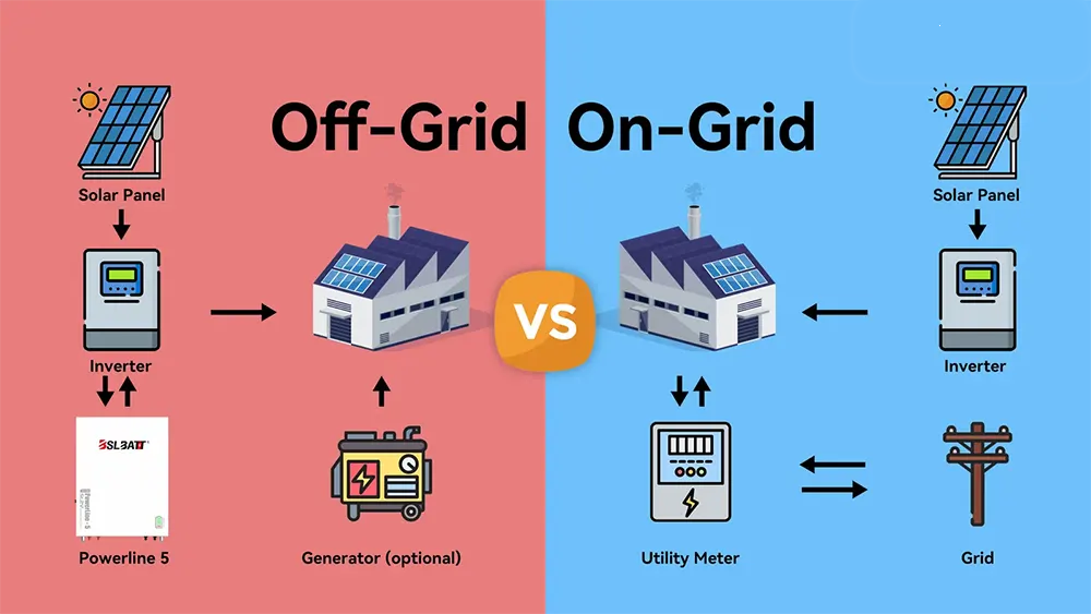 | ذخیره انرژی | معمولاً به باتری نیاز ندارد (شبکه نقش باتری را بازی میکند). | برای تأمین برق در شب و روزهای ابری، نیاز مبرم به بانک باتری دارد. |